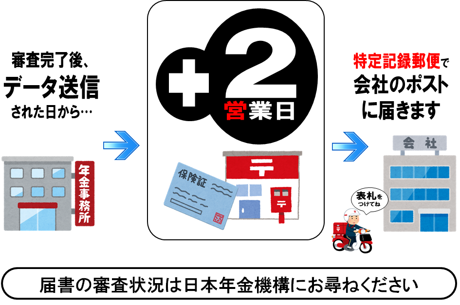 入社の際によく「保険証はいつ届きますか?」と従業員さんから質問があるかと思います。 協会けんぽからの保険証の発送は、日本年金機構での審査確認(登録処理)完了日の…